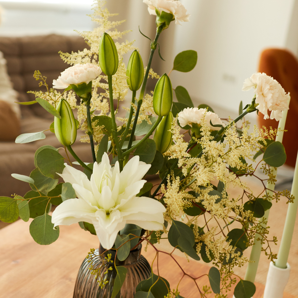 Банч на основе лилии, гвоздик, астильбы и эвкалипта
