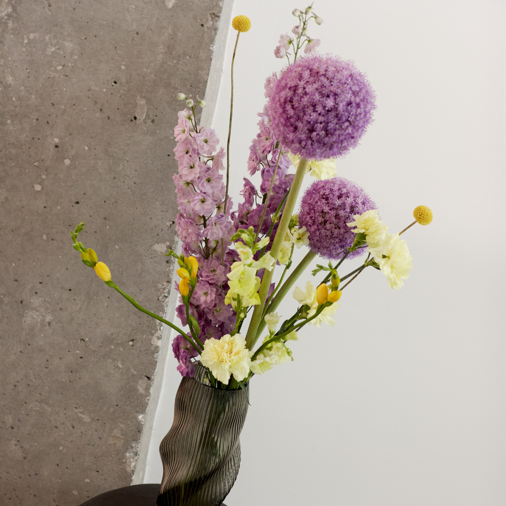 Банч на основе аллиума, дельфиниума, желтой фрезии, гвоздик, антиринума