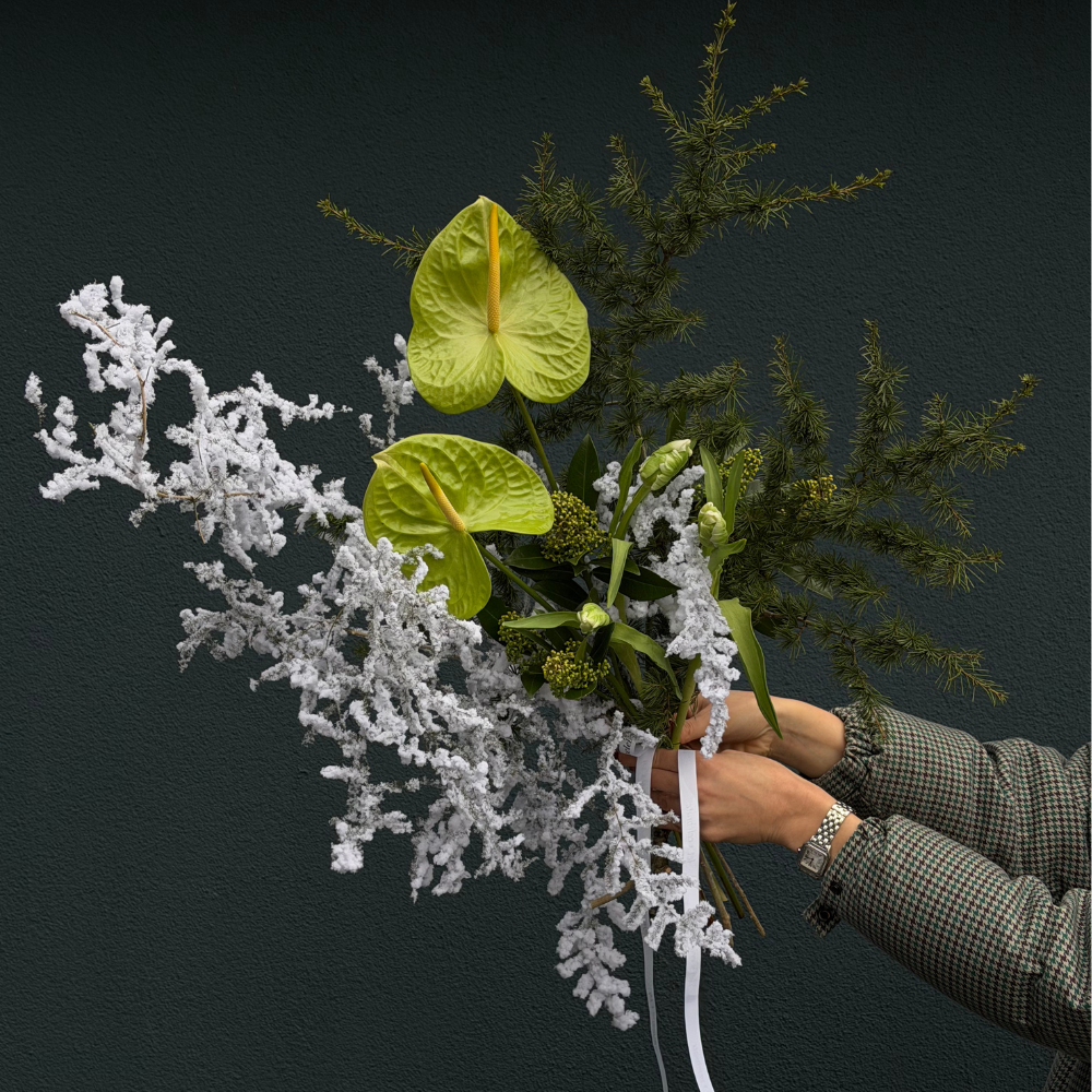 Букет из хвойных веточек, спренгерии Вайлд(белые заснеженные веточки), антуриума, тюльпанов