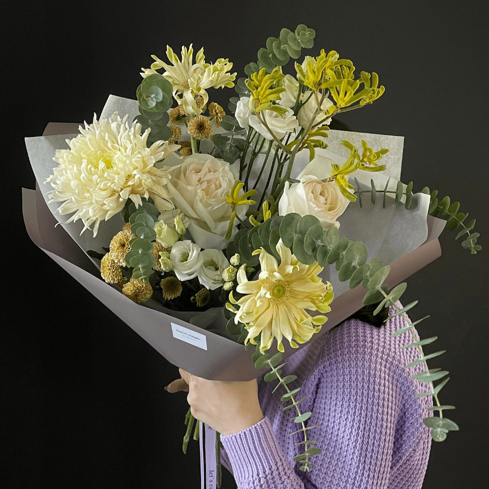 Букет из розы О Хара, герберы, хризантемы кустовой, хризантемы Авиньон, эустомы, анигозантуса и эвкалипта