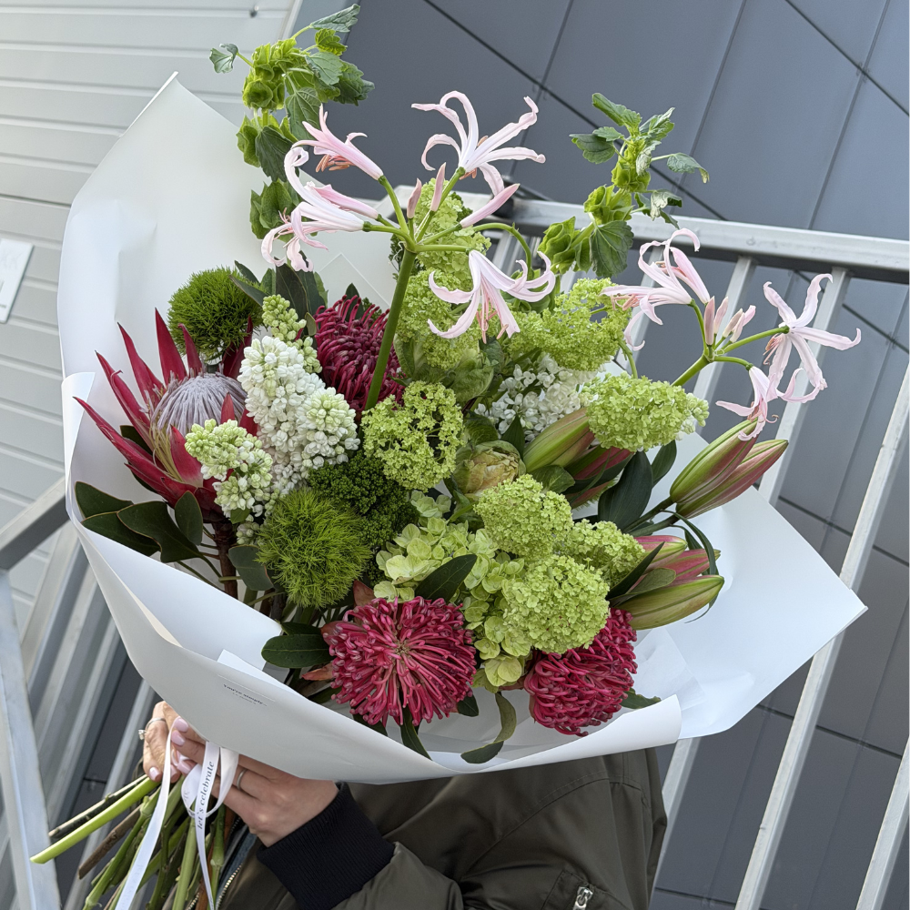 Букет из двух сортов протей, нерине, лилии, сирени, гвоздики киви, молюцеллы, вибурнума.