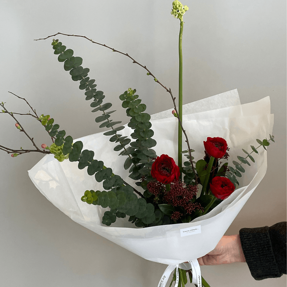 Букет из ранункулюсов, орнитогалума, цветущих веточек, скимии и эвкалипта
