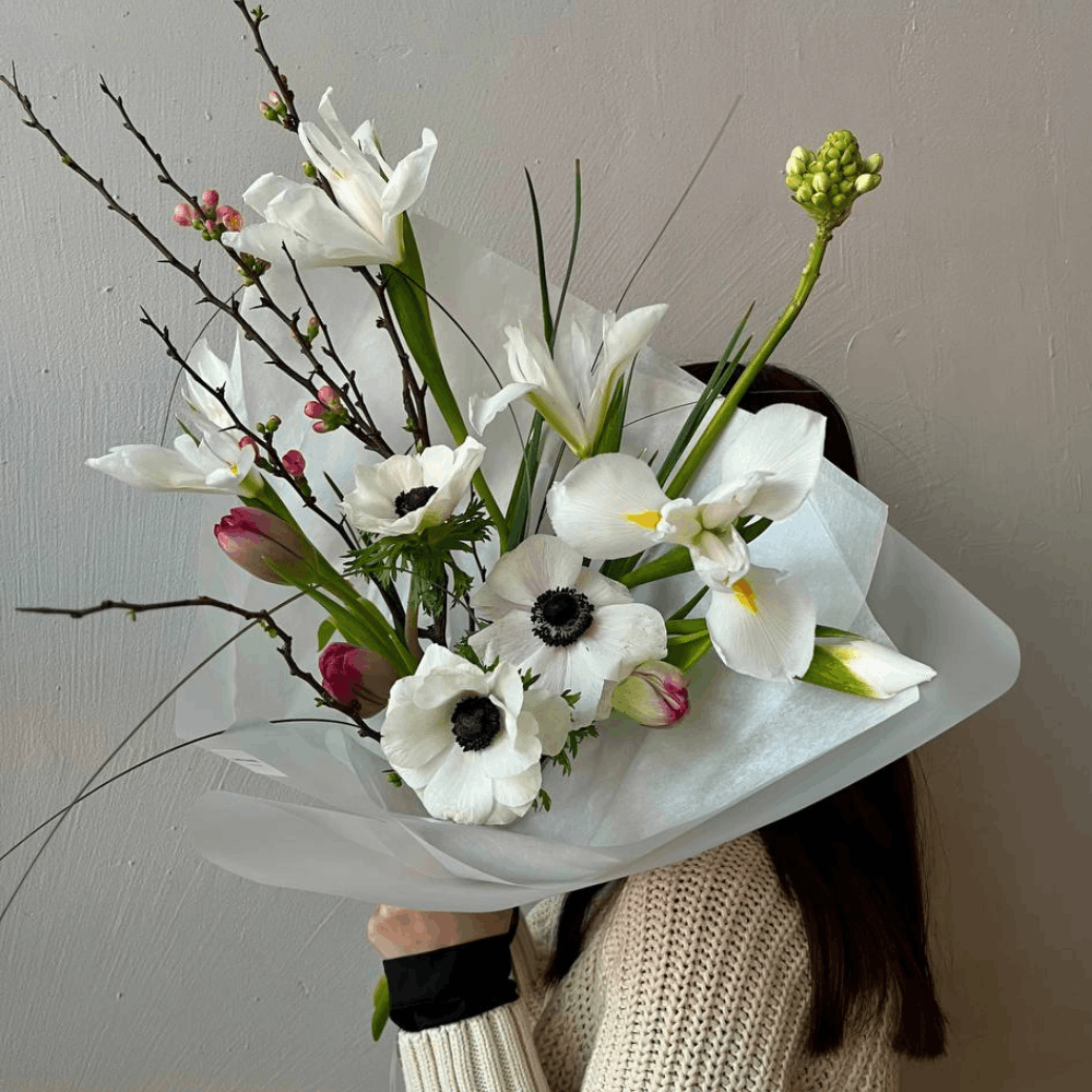 Букет из анемонов, ирисов, тюльпанов и зелени