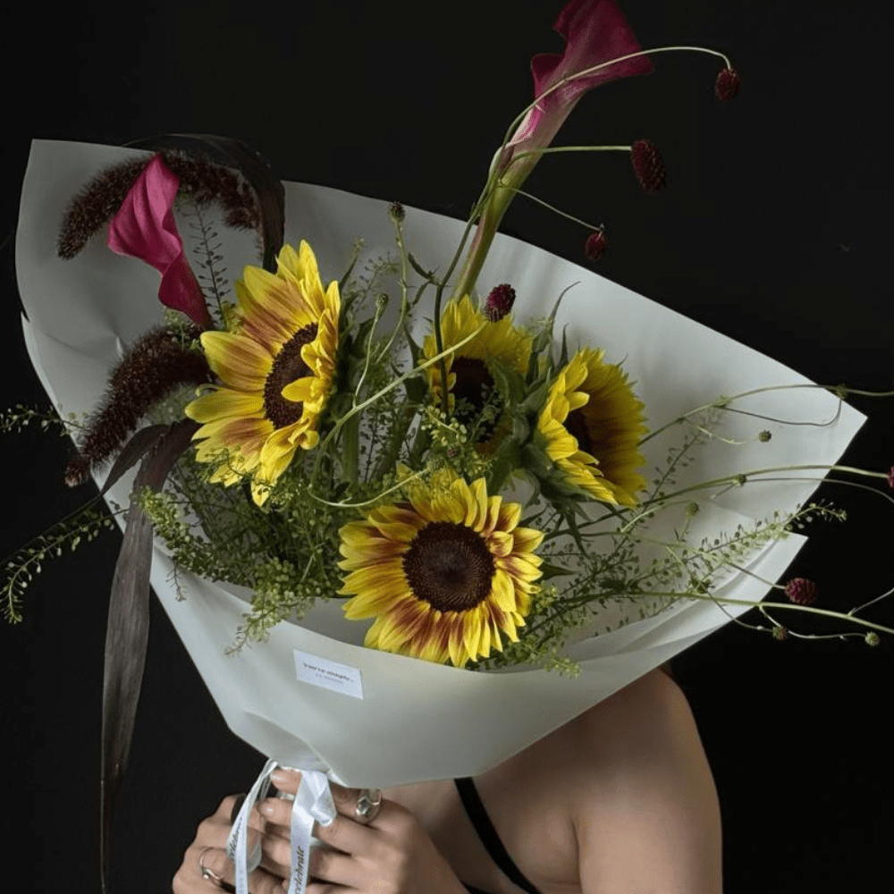 Букет на основе подсолнухов, калл и тласпи