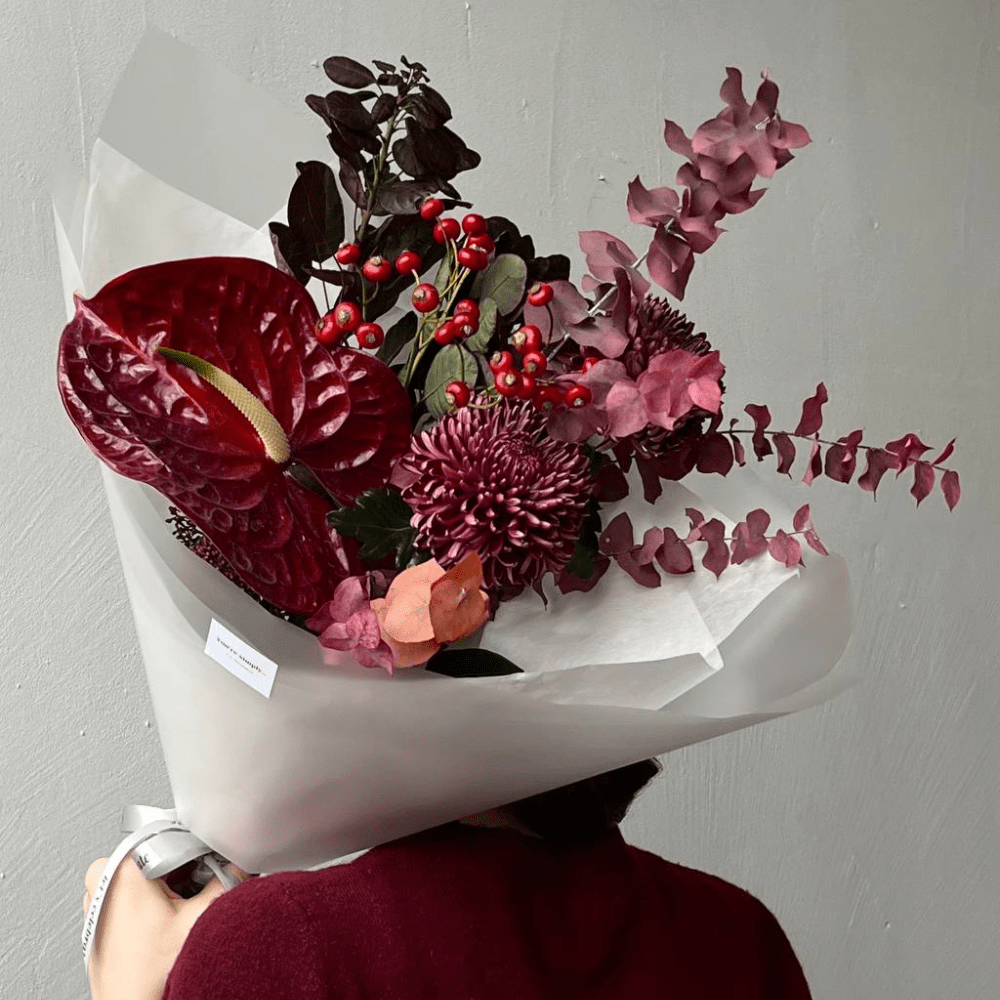 Букет из антуриума, хризантем, осенних ягод и стабилизированного эвкалипта