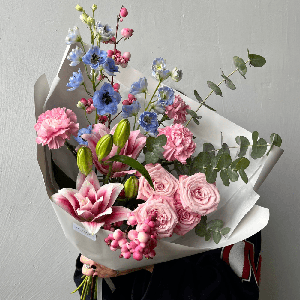 Букет из лилии, кустовой розы, дельфиниума, гвоздик, симфорикарпуса и эвкалипта