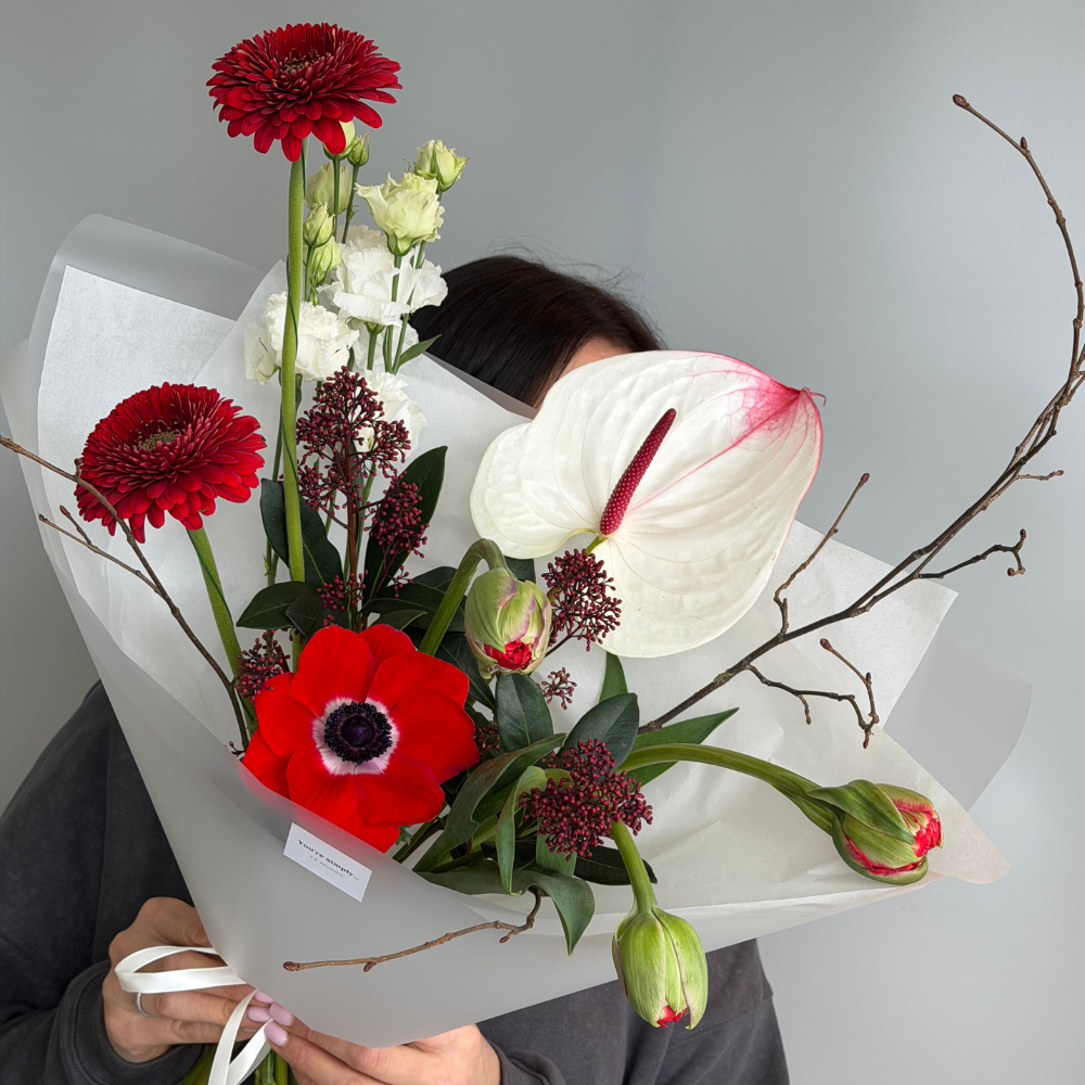 Букет на основе анемонов, антуриума, гербер, скимии, тюльпанов и эустомы