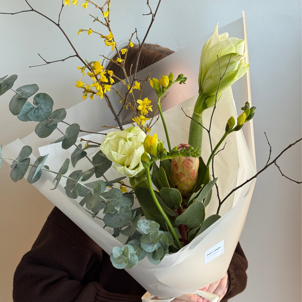 Букет с амариллисом, протеей, веточкой форзиции, эвкалипта, фрезии