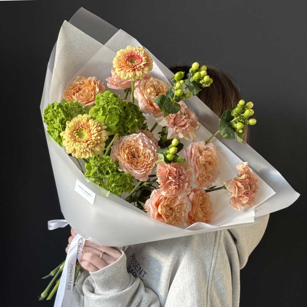 Букет на основе кустовой розы Джульетта, гортензии, гербер и диантусов