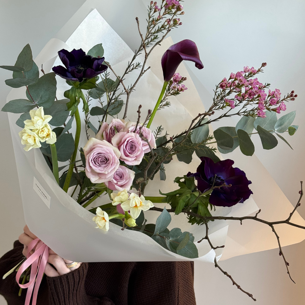 Букет-комплимент на основе анемонов, кустовой розы, калл, нарциссов, хамелациума и эвкалипта