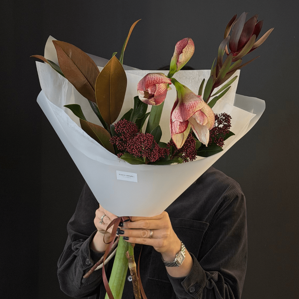 Букет на основе амариллиса, леукадендрона, листьев магнолии и скимии