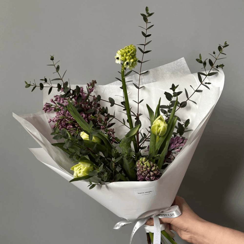 Букет на основе сирени, тюльпанов, гиацинтов, орнитогалума и эвкалипта