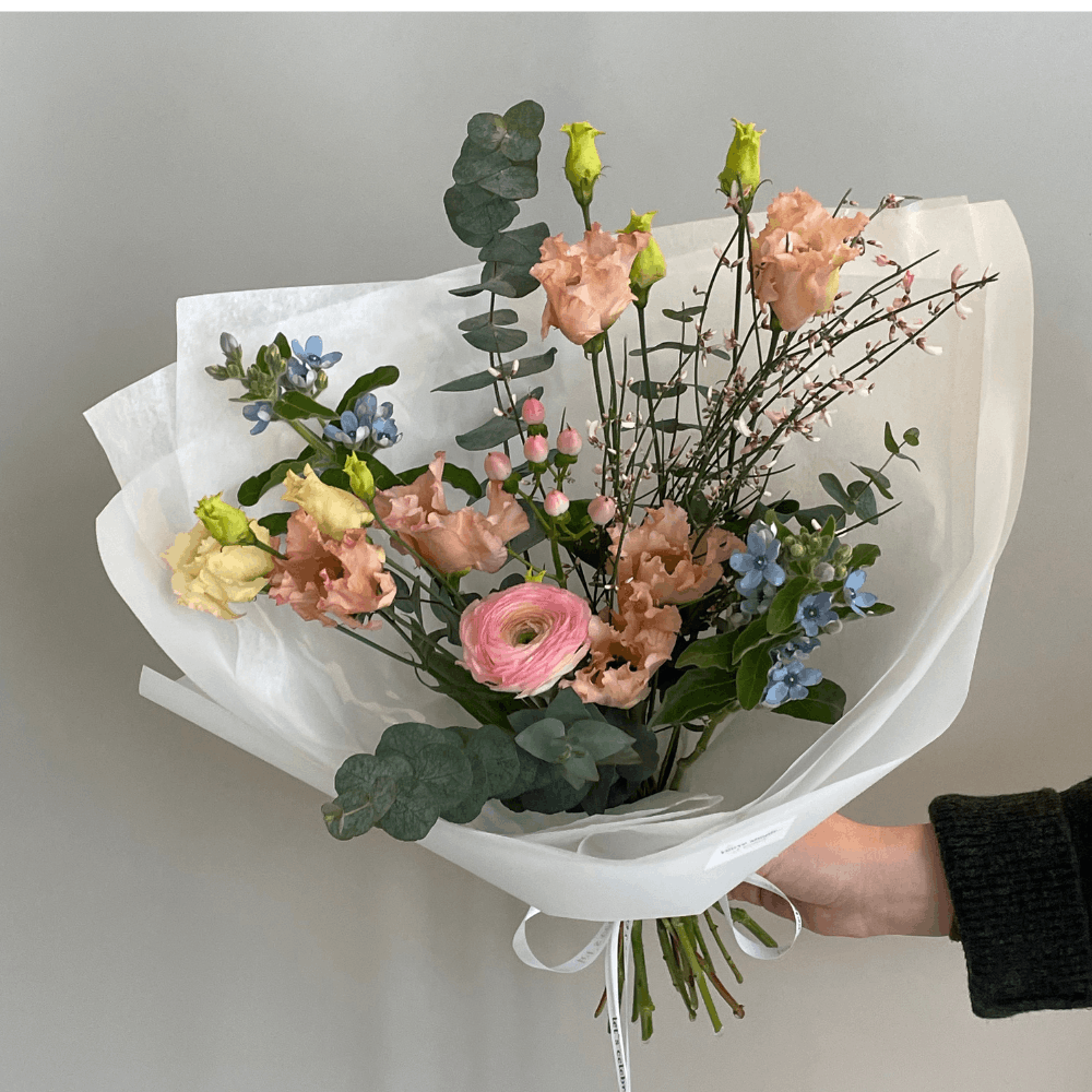 Букет из ранункулюса, эустомы, оксипеталума, гиперикума, генисты и эвкалипта