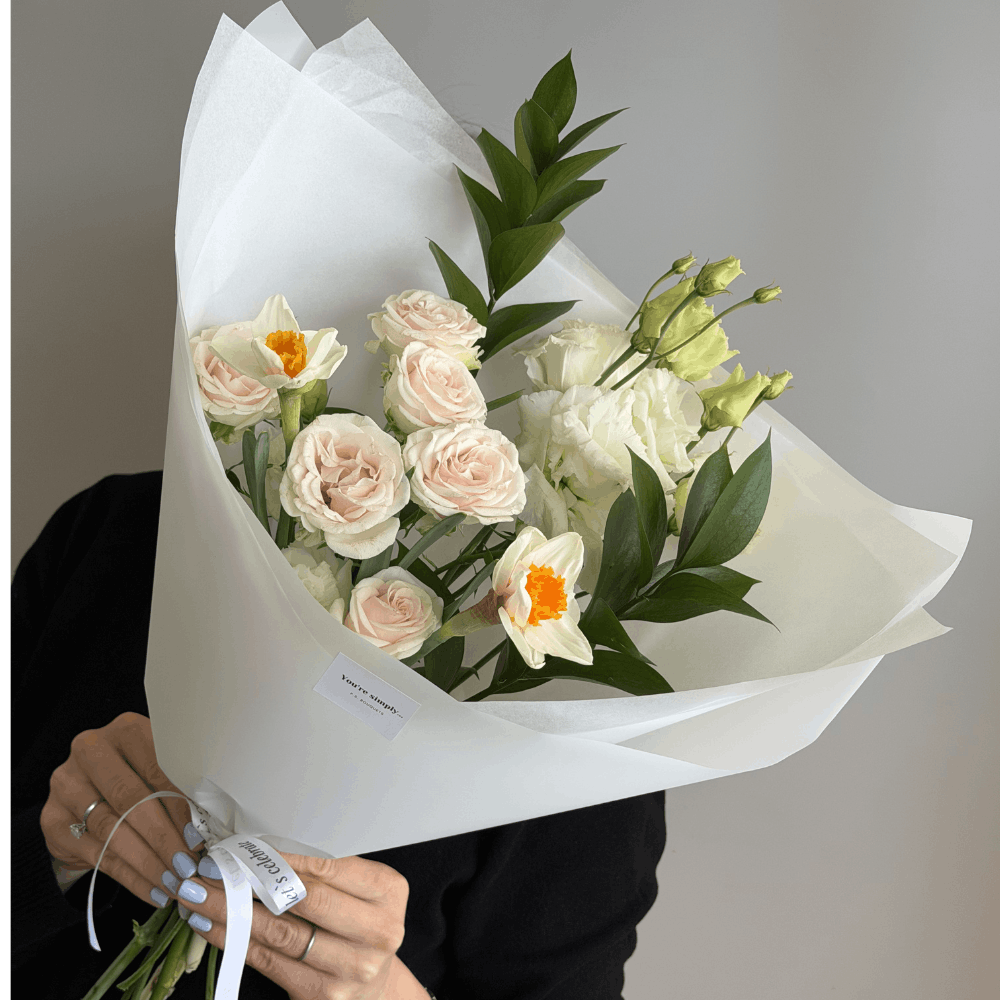 Букет из кустовой розы Софи, нарциссов, эустомы и рускуса