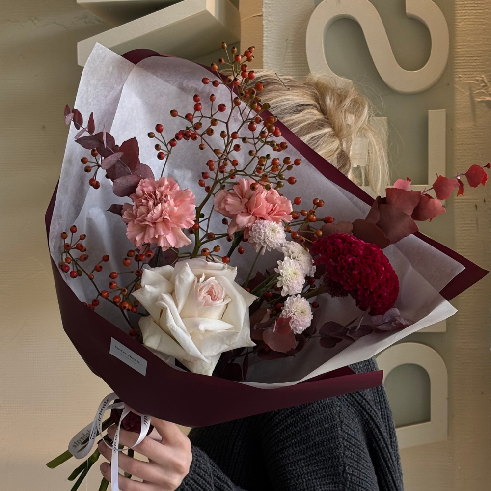 Букет-комплимент на основе розы О’хара, целлозии, хризантемы и диантоусов