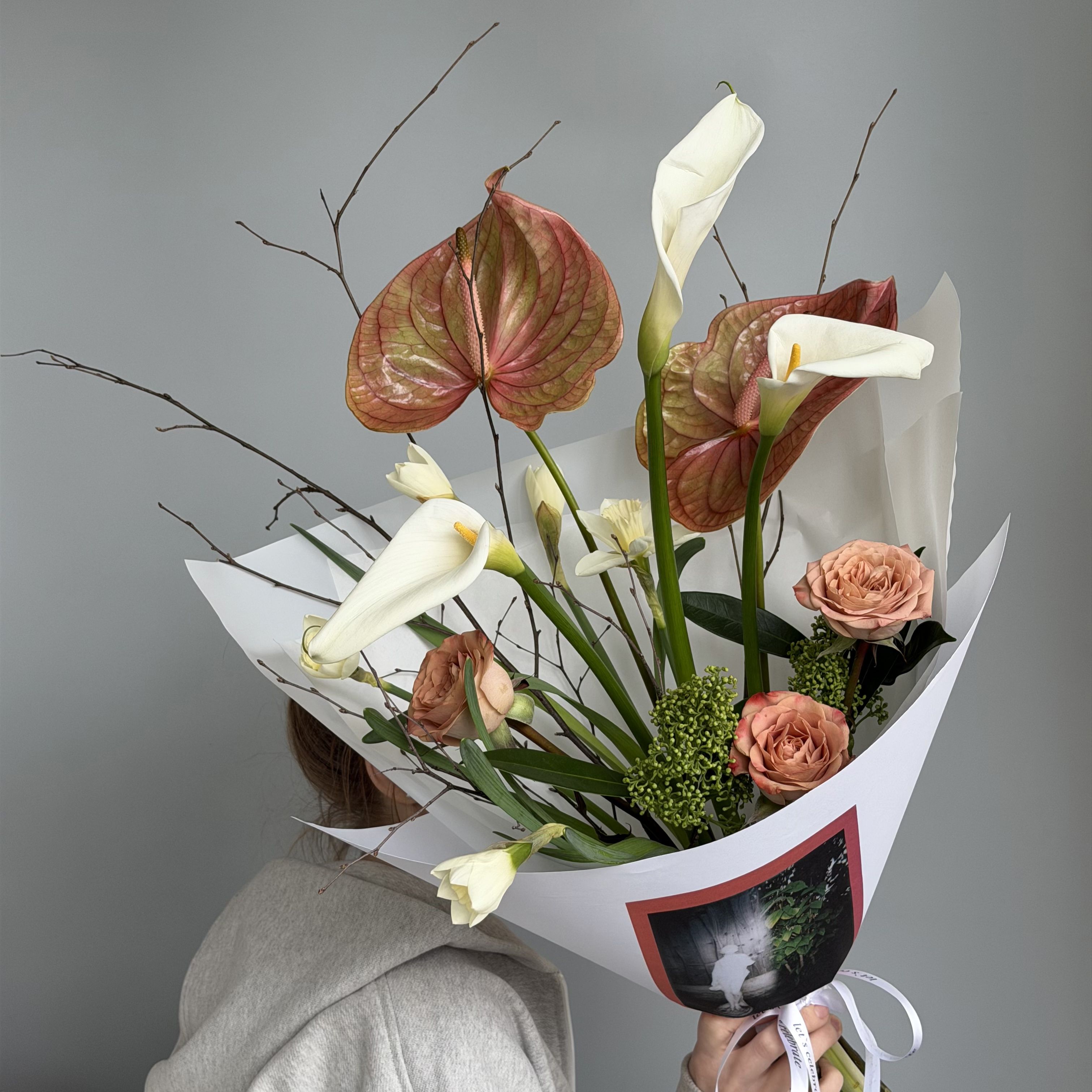 Красота в чистом виде – букет из антуриумов, калл, нарциссов, скимии, розы “Капучино”.