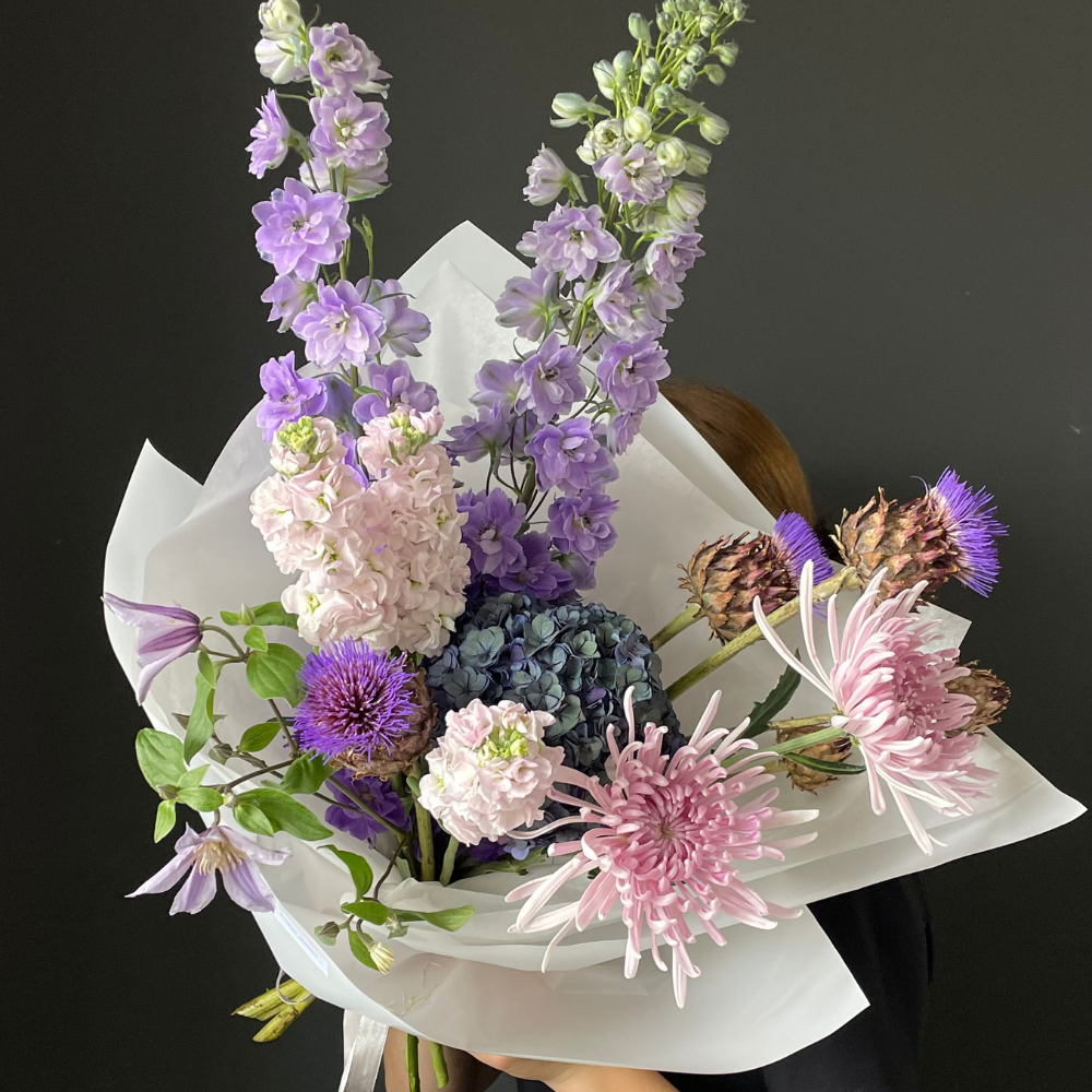 Букет на основе гортензии, дельфиниума, матиолы, хризантем
