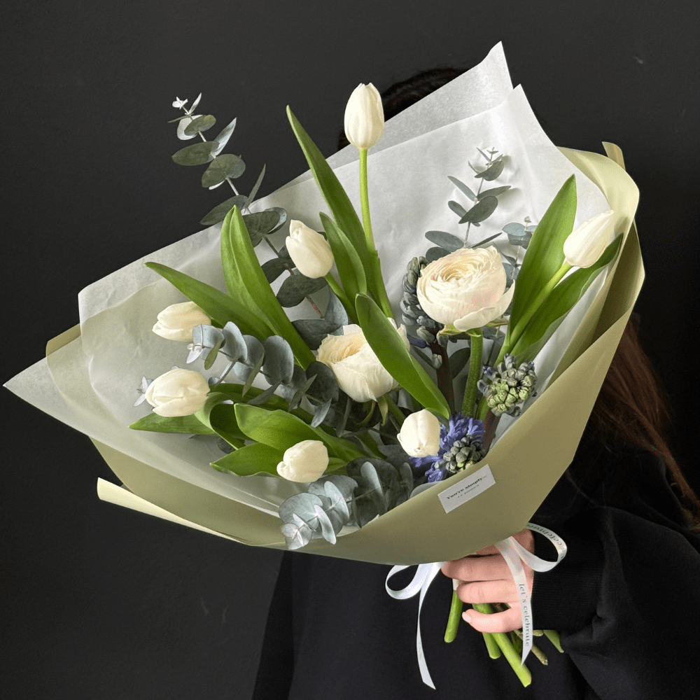 Воздушный весенний букет с ранункулюсами, гиацинтами и эвккалиптом.