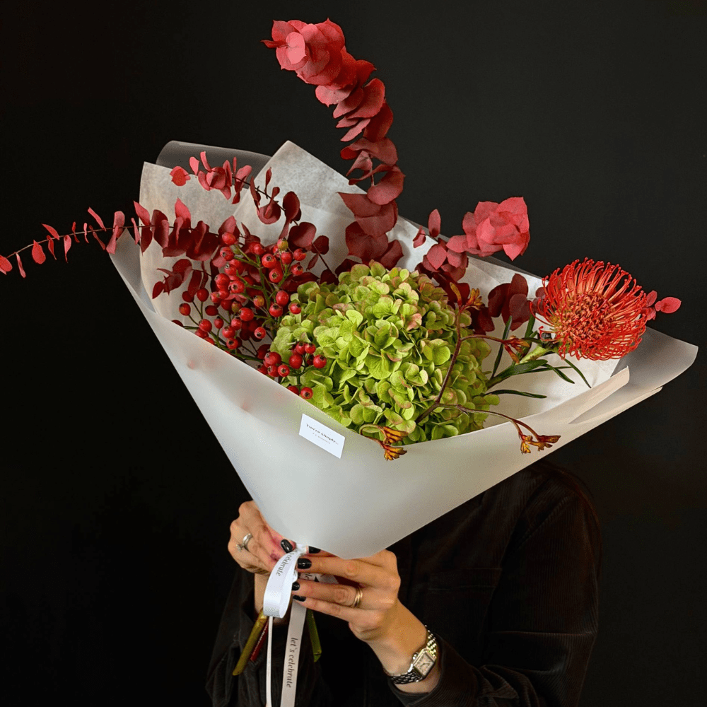 Букет из гортензии, леукоспермума, осенних ягод, анигозантуса и стабилизированного эвкалипта