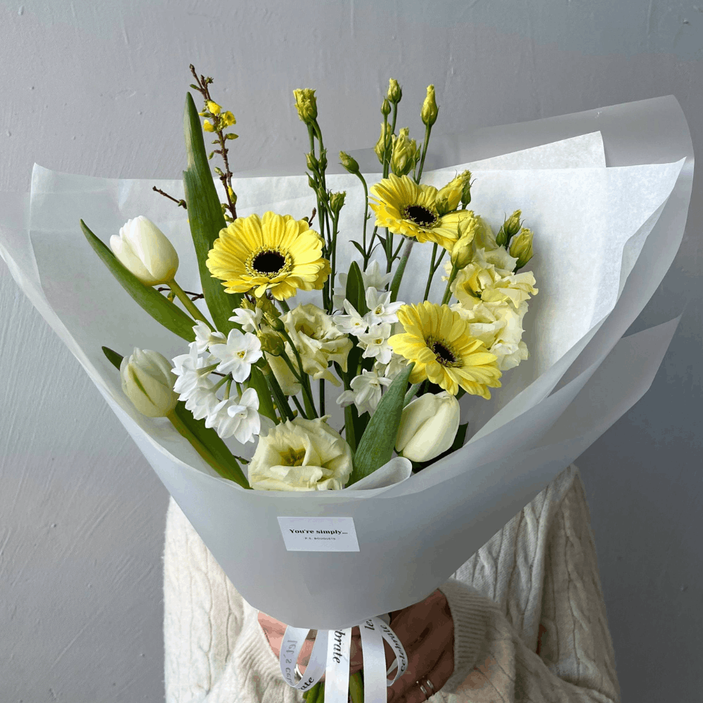 Букет из тюльпанов, нарциссов, гербер, эустомы и форзиции