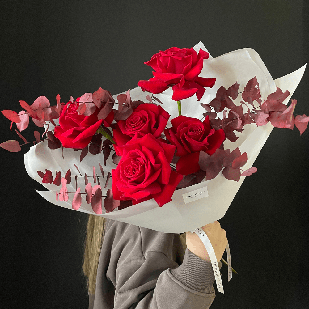 Букет из алых роз и стабилированного эвкалипта