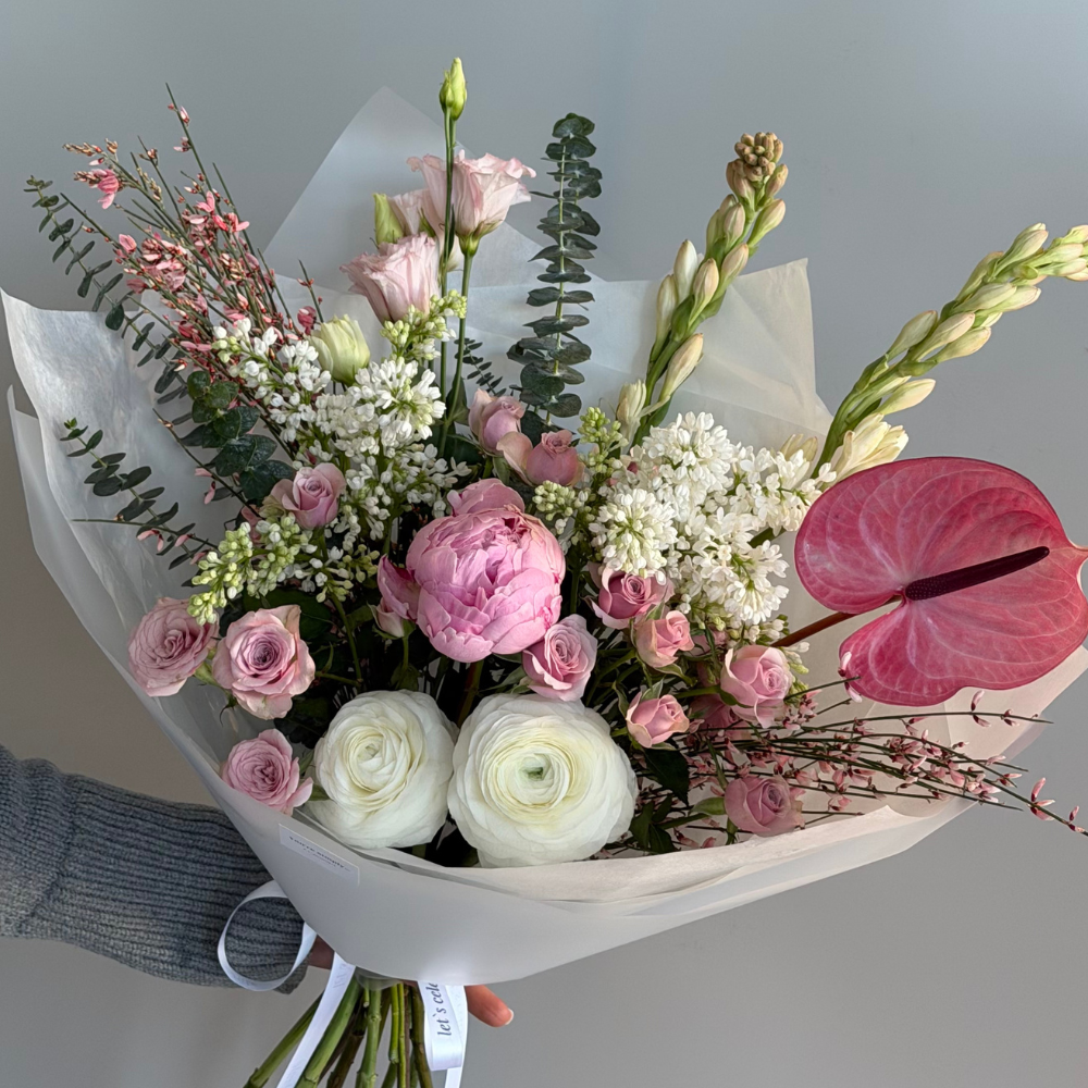 Букет на основе пионов, сирени, тубирозы, антуриума, генисты, ранункулюса, кустовой розы и эустомы