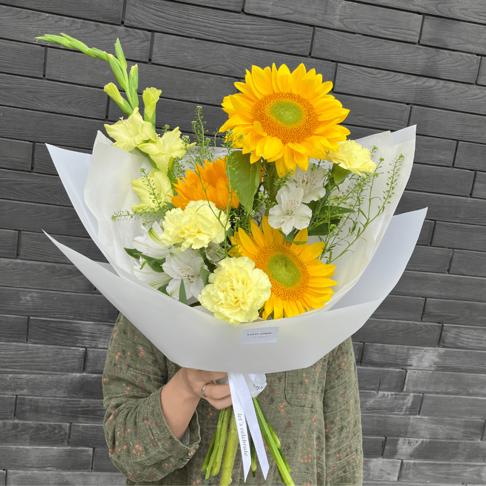 Букет на основе подсолнухов, гвоздик, гладиолуса и альстромерии