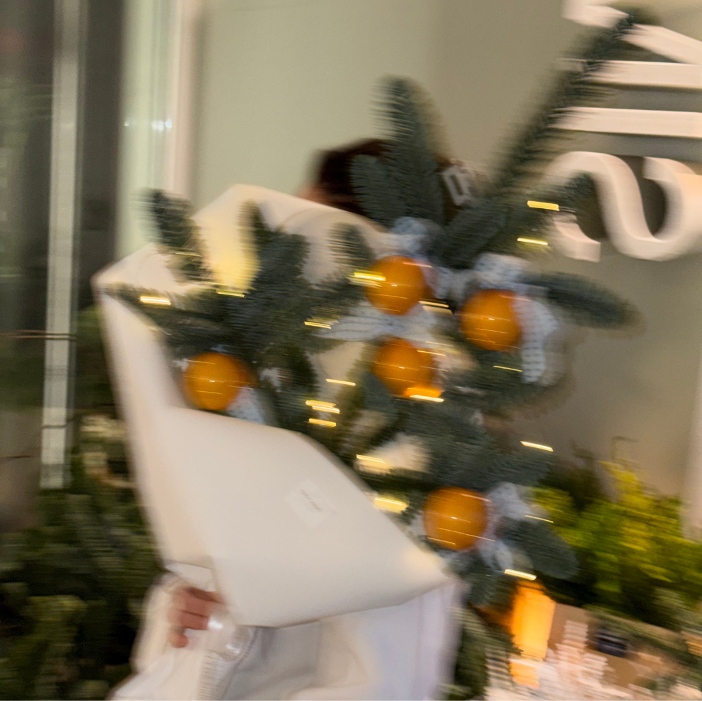 Букет на основе веточек нобилиса с шариками-мандаринами и огоньками