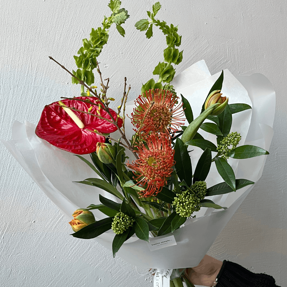 Букет с антуриумом, леукоспермумами, молюцеллой, тюльпанами и скимиией