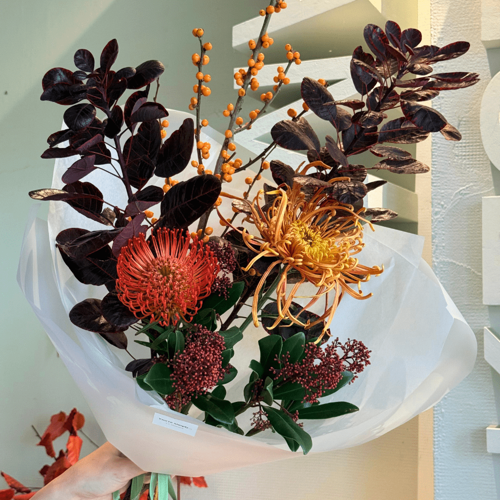 Стойкий осенний букет из нутана, сортовой хризантемы, котинуса, скимии и илекса. Идет в высокой брендированной коробке.