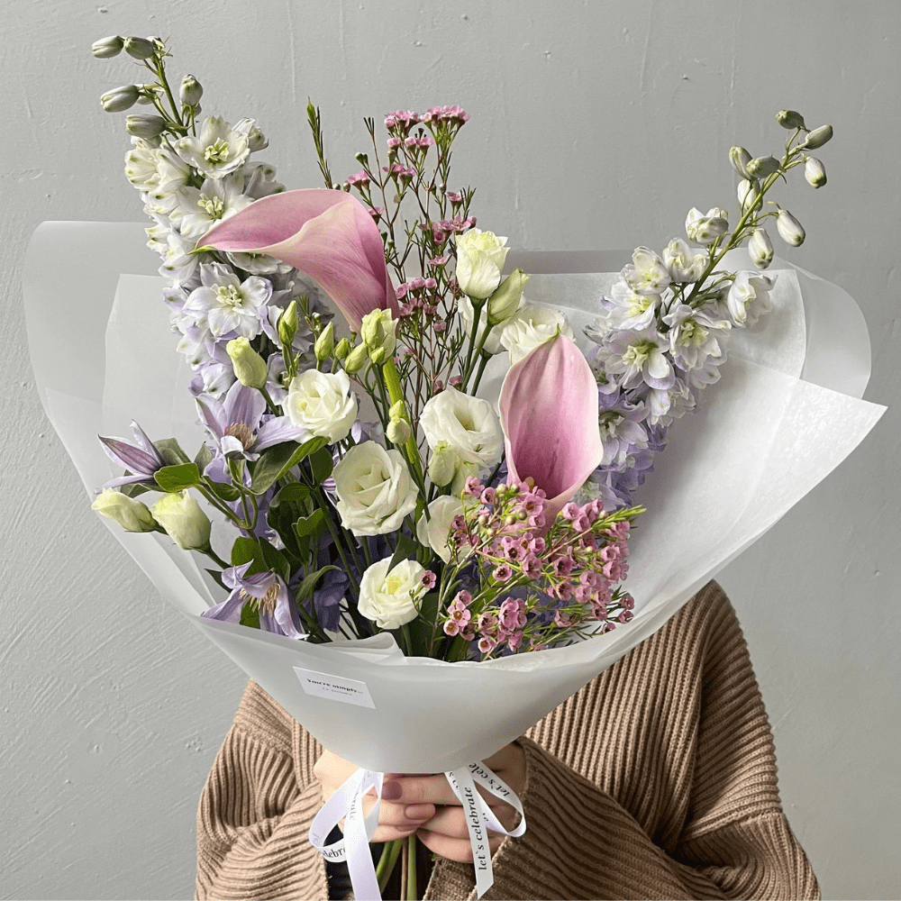 Букет из дельфиниумов, калл, клематиса, эустомы и хамелациума