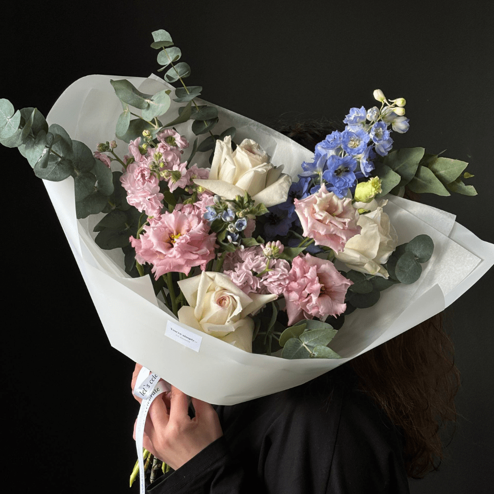 Букет из розы, дельфиниума, эустомы, маттиолы, твидии и эвкалипта