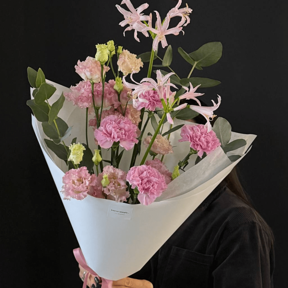 Букет из эустомы, гвоздик, эвкалипта и нерине