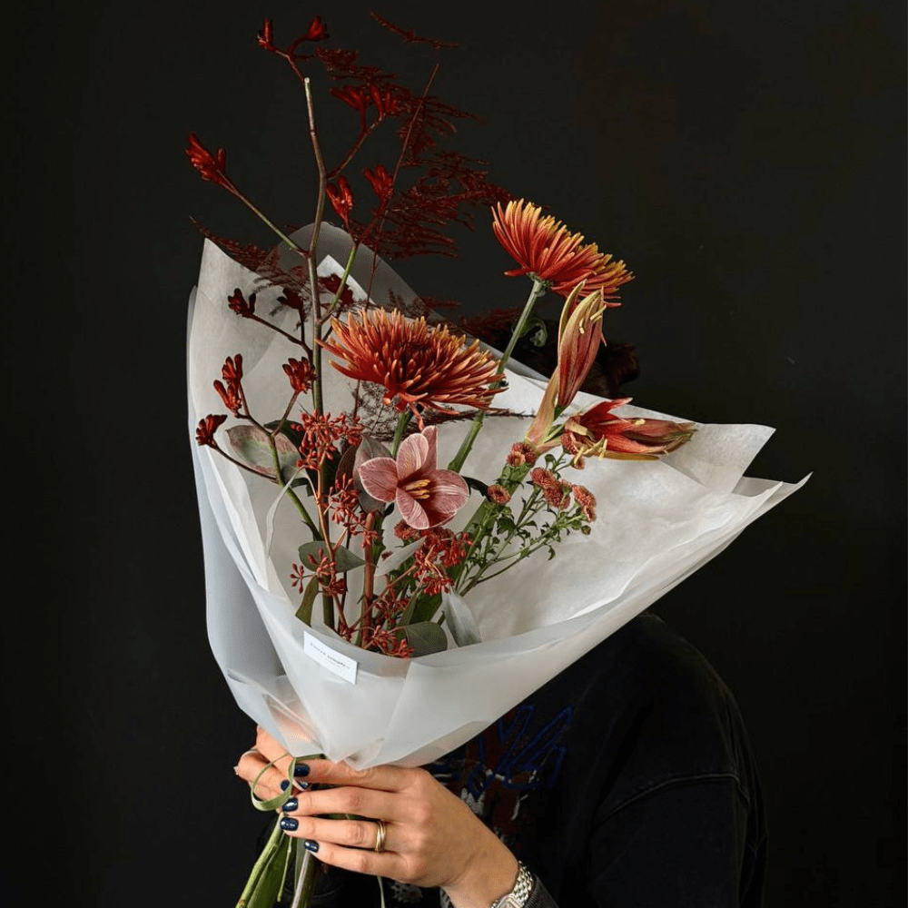 Букет из амарилиса, тюльпана, хризантемы, онигозантуса и зелени