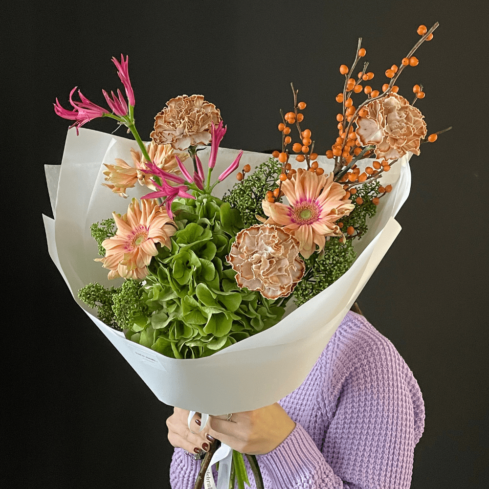 Букет из гортензии, гербер, гвоздик, илекса, нерине и скимии