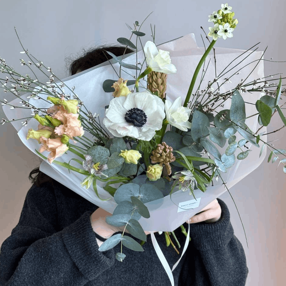 Букет с анемоном, гиацинтом, эустомой, нарциссами, генистой, орнитогалумом и эвкалиптом