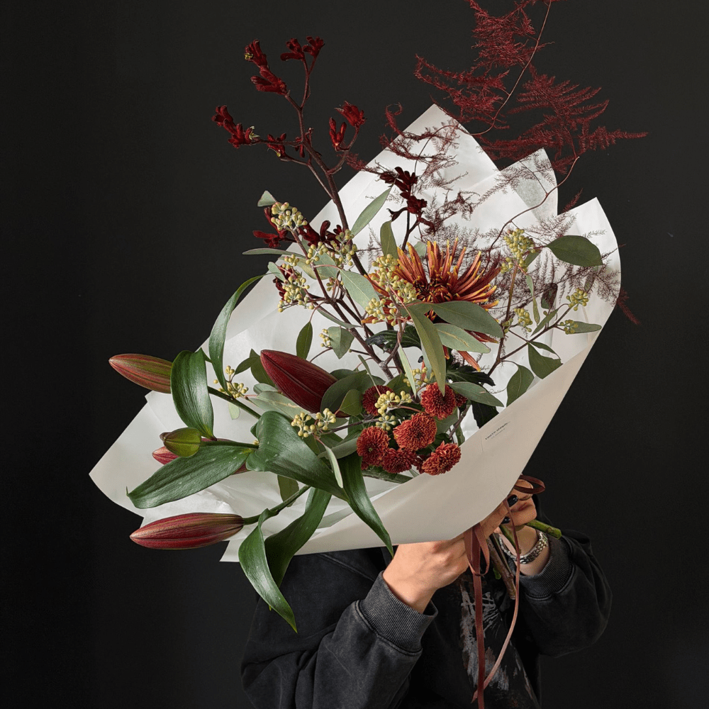Букет из лилии, кустовой хризантемы, хризантемы сорта Бальтазар, анигозантуса, аспарагуса и эвкалипта