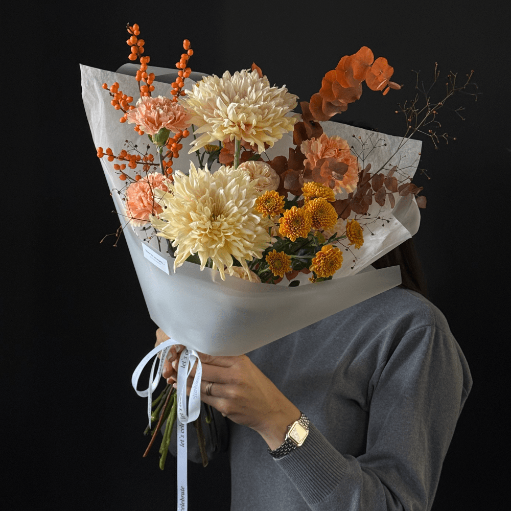 Букет на основе хризантемы, гвоздик, илекса и стабилизированного эвкалипта
