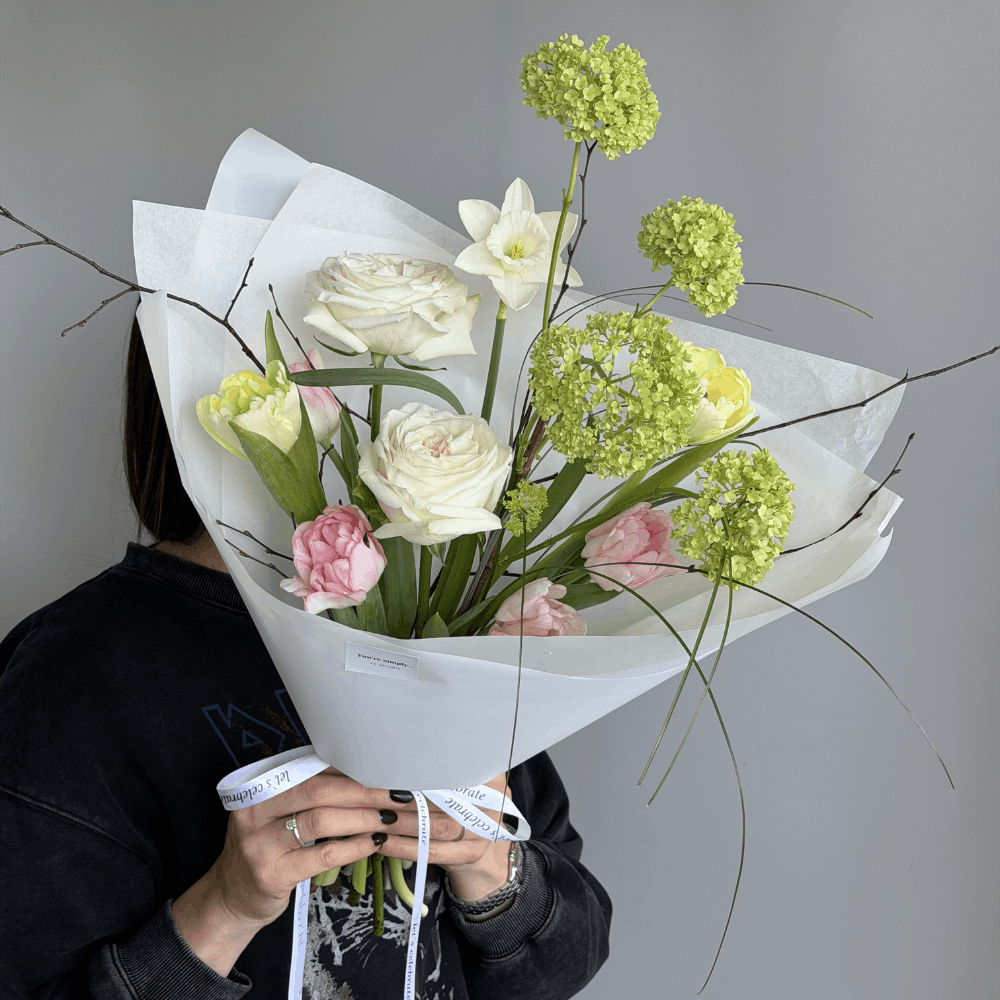 Букет из тюльпанов, розы, вибурнума, нарцисса и весенних веточек