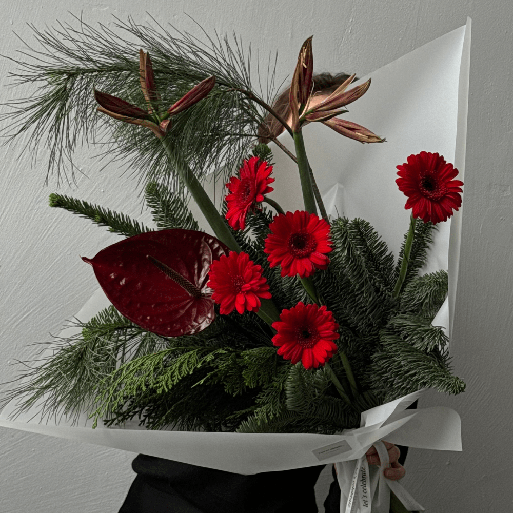 Букет на основе амариллиса, антуриума, гербер, нобилиса и хвои