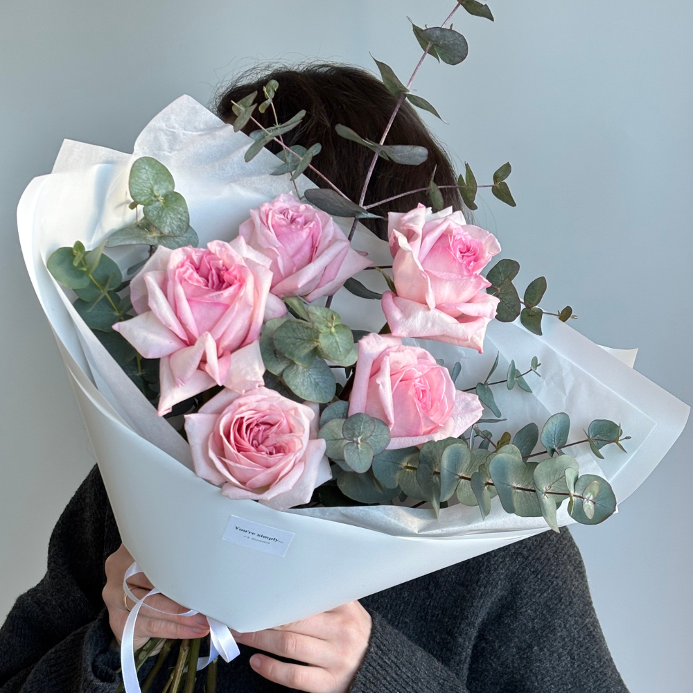 Букет из одноголовой розы Pink О’хара и эвкалипта
