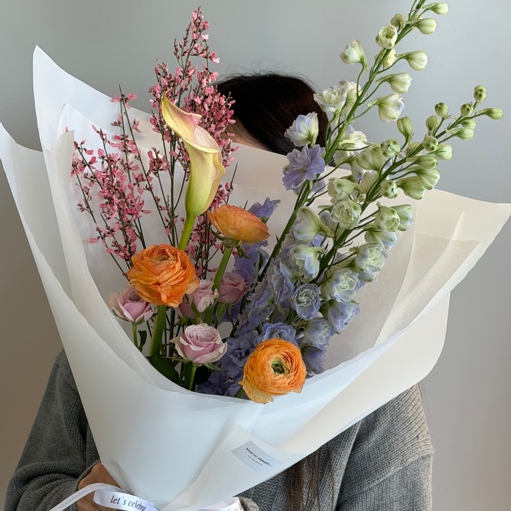 Букет из дельфиниума, генисты, ранункулюсов, калл, кустовой розы