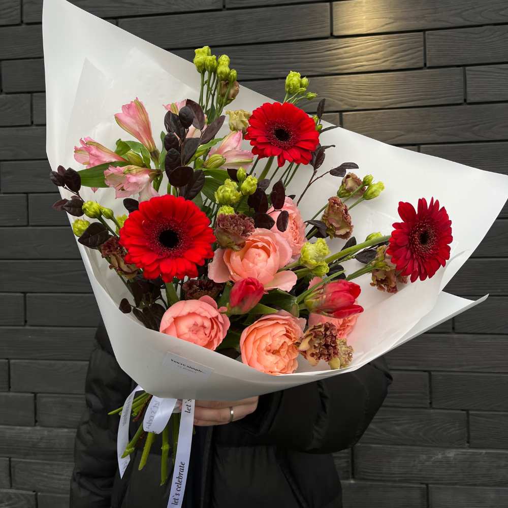 Букет с красными герберами и пионовидными розами, который добавит ярких красок в любой,  даже самый пасмурный, день.