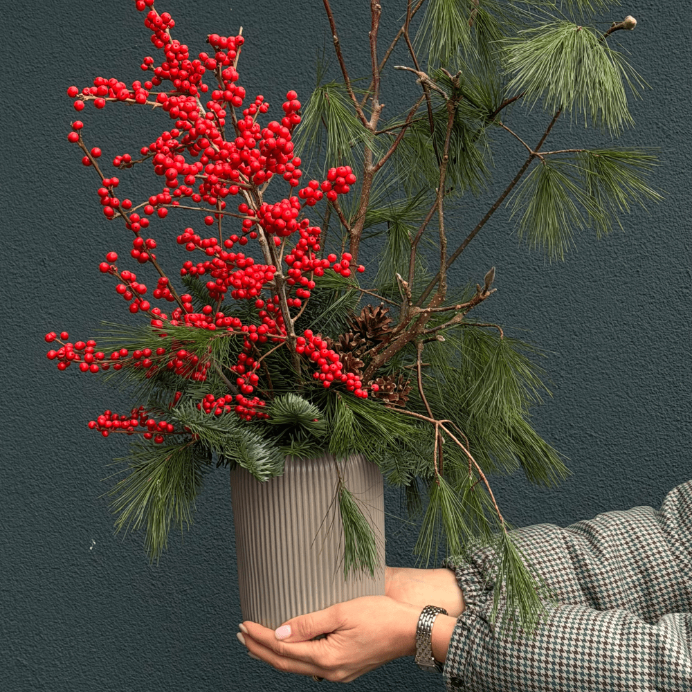 Композиция в вазе из еловых веток, нобилиса и илекса