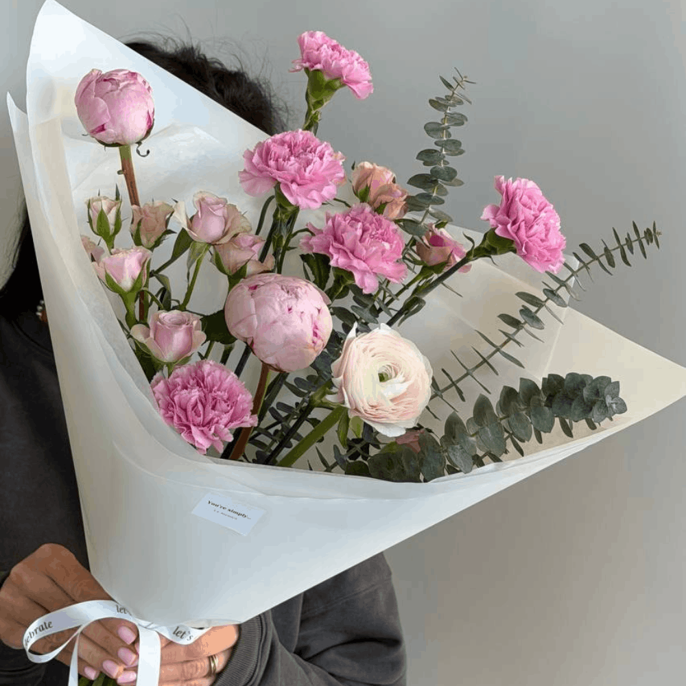 Букет из кустовой розы, пионов, ранункулюса, гвоздик и эвкалипта