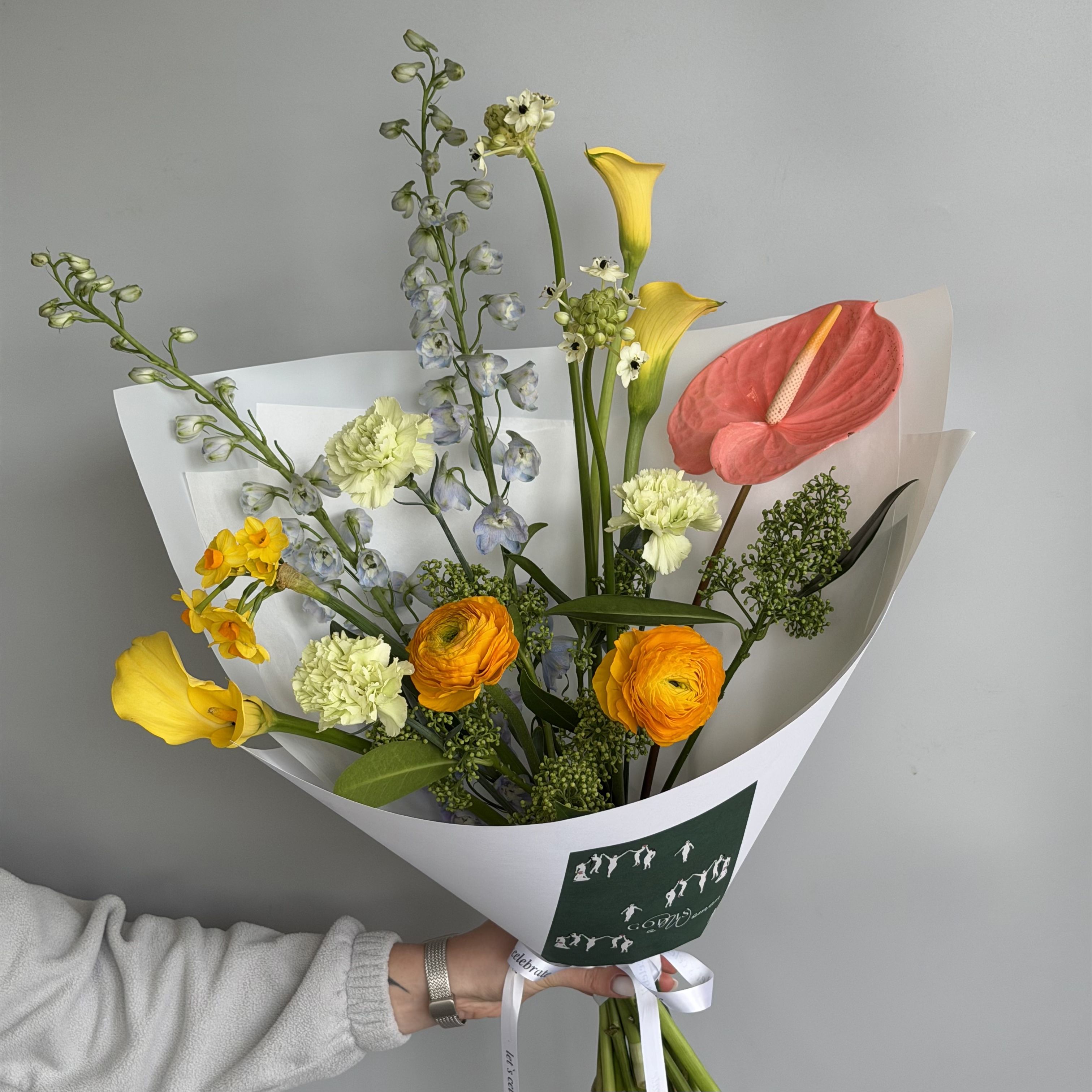 Дофаминовый букет из антуриума, дельфиниума, ранункулюсов, калл, гвоздик, скимии, нарциссов, орнитагалума.