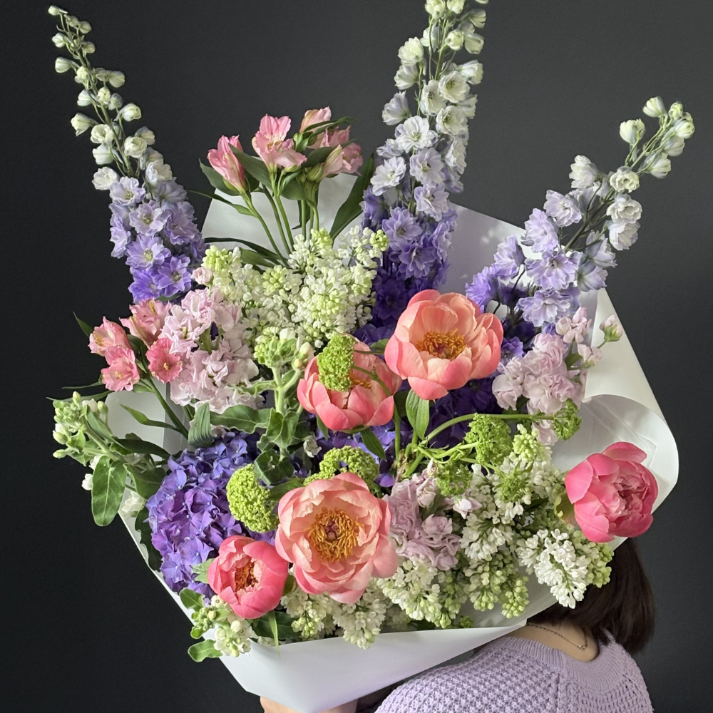 Роскошный букет из дельфиниумов, пионов сорта Корал Шарм, сирени, альстромерии, маттиолы, гортензии и вибурнума