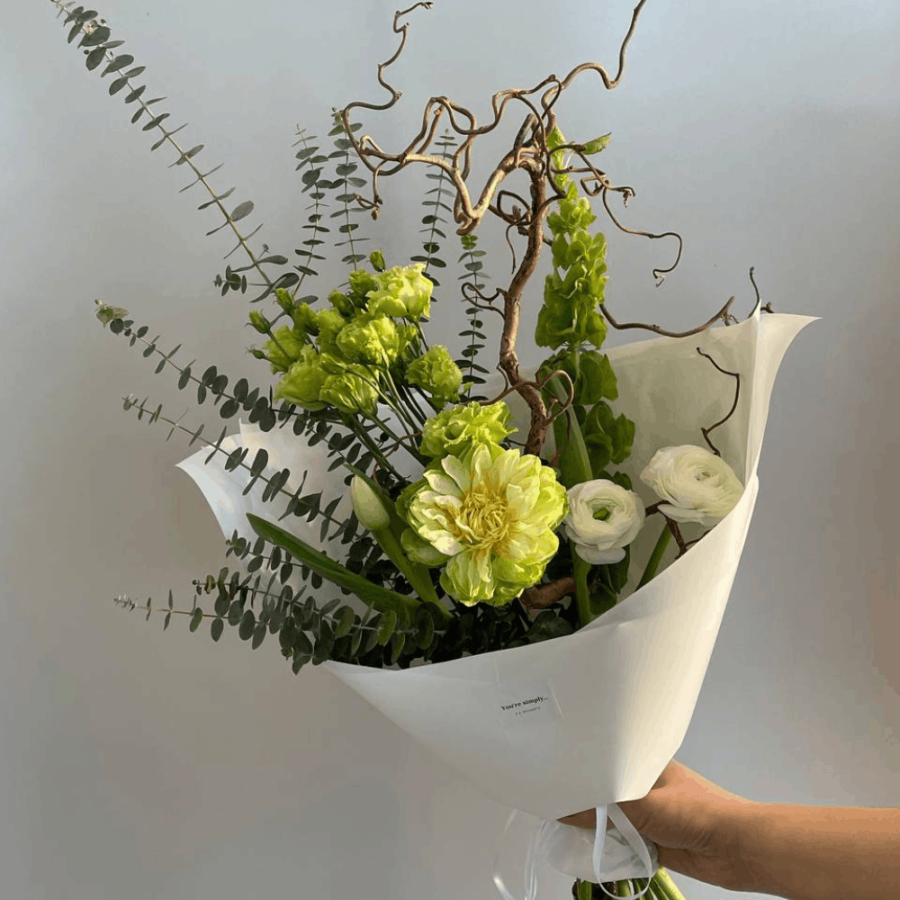 Букет из эустомы,  тюльпанов, розы вегги, ранункулюсов, молюцеллы и эвкалипта