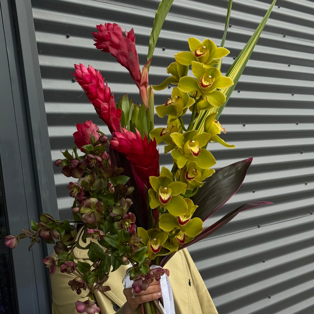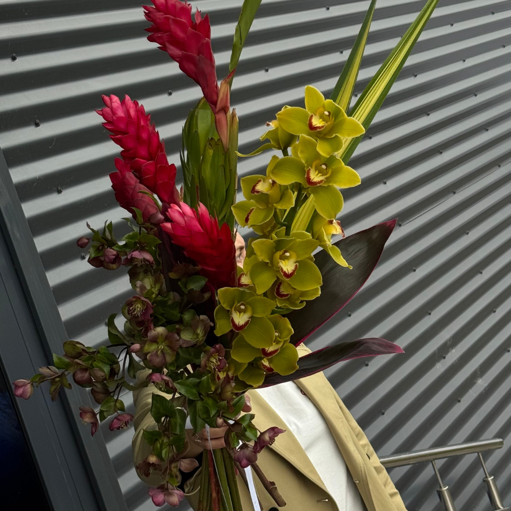 WOW-букет на основе леукадендрона, имбиря красного и цимбидиума.