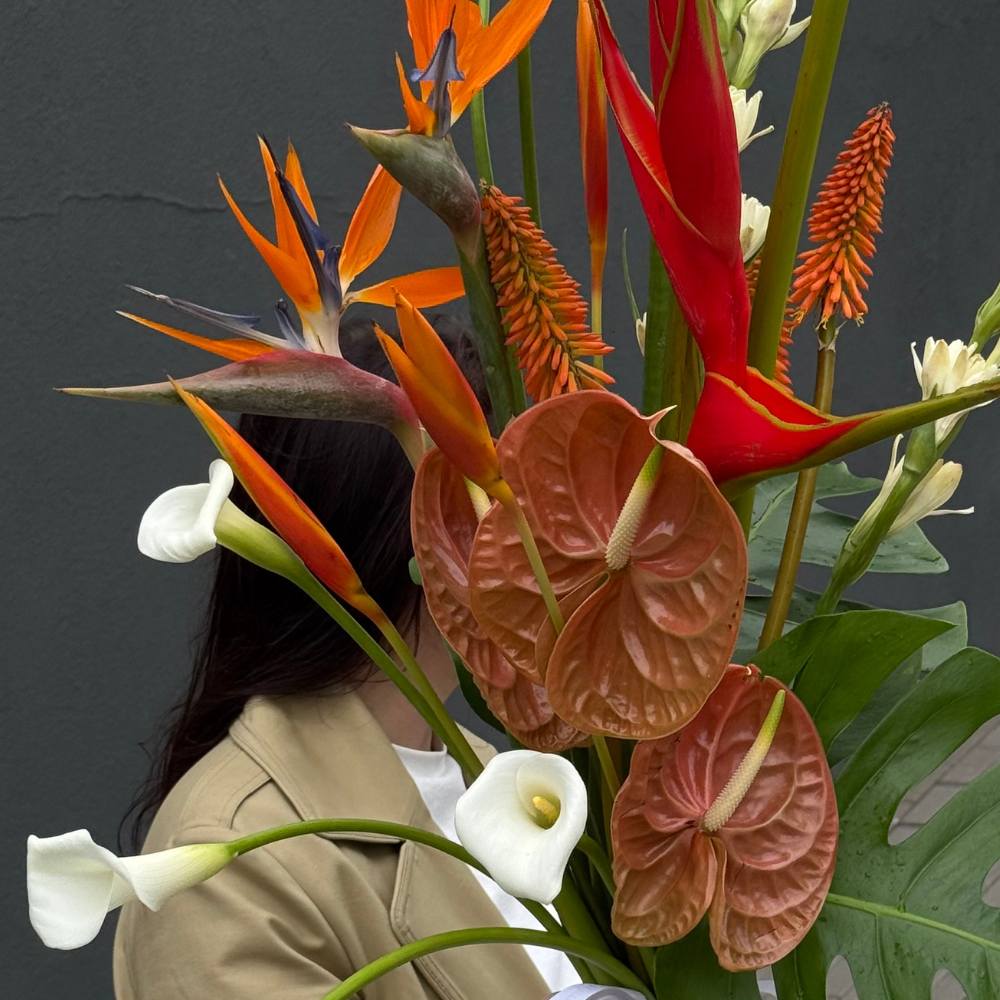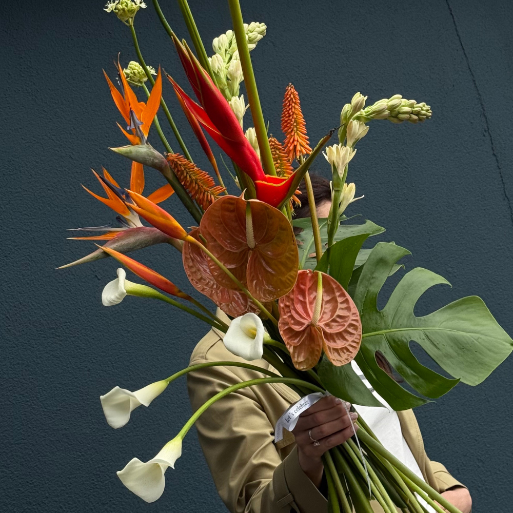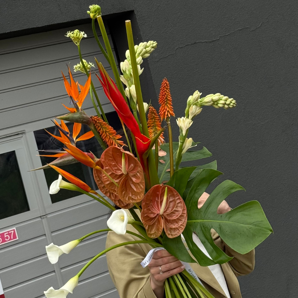 WOW-букет на основе антуриумов, стрелиции, тубирозы, орнитогалума, калл.